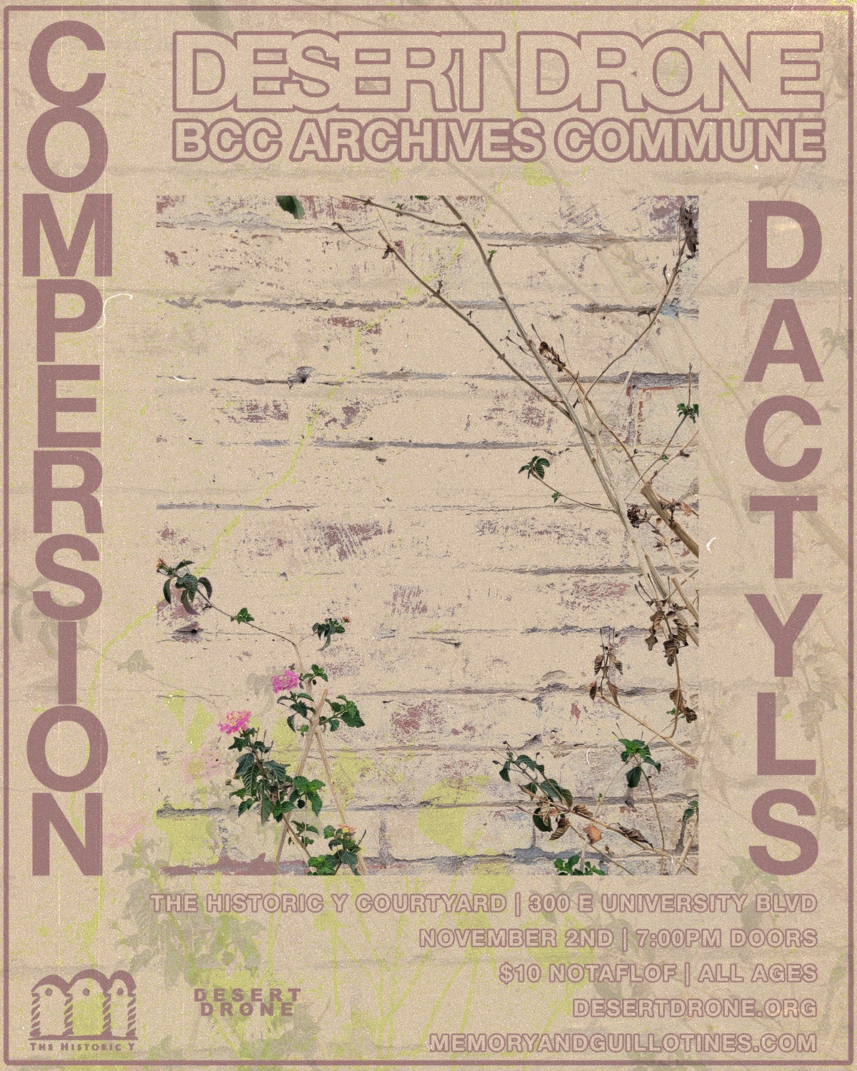 Sunday, November 2nd, Desert Drone presents a special evening in The Historic Y Courtyard with Dactyls and Compersion. Celebrating two of our favorite local acts coming together to play music outside on a beautiful fall evening.